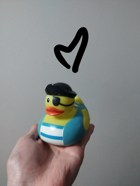 A rubber duck in a pirate suit on my hand.