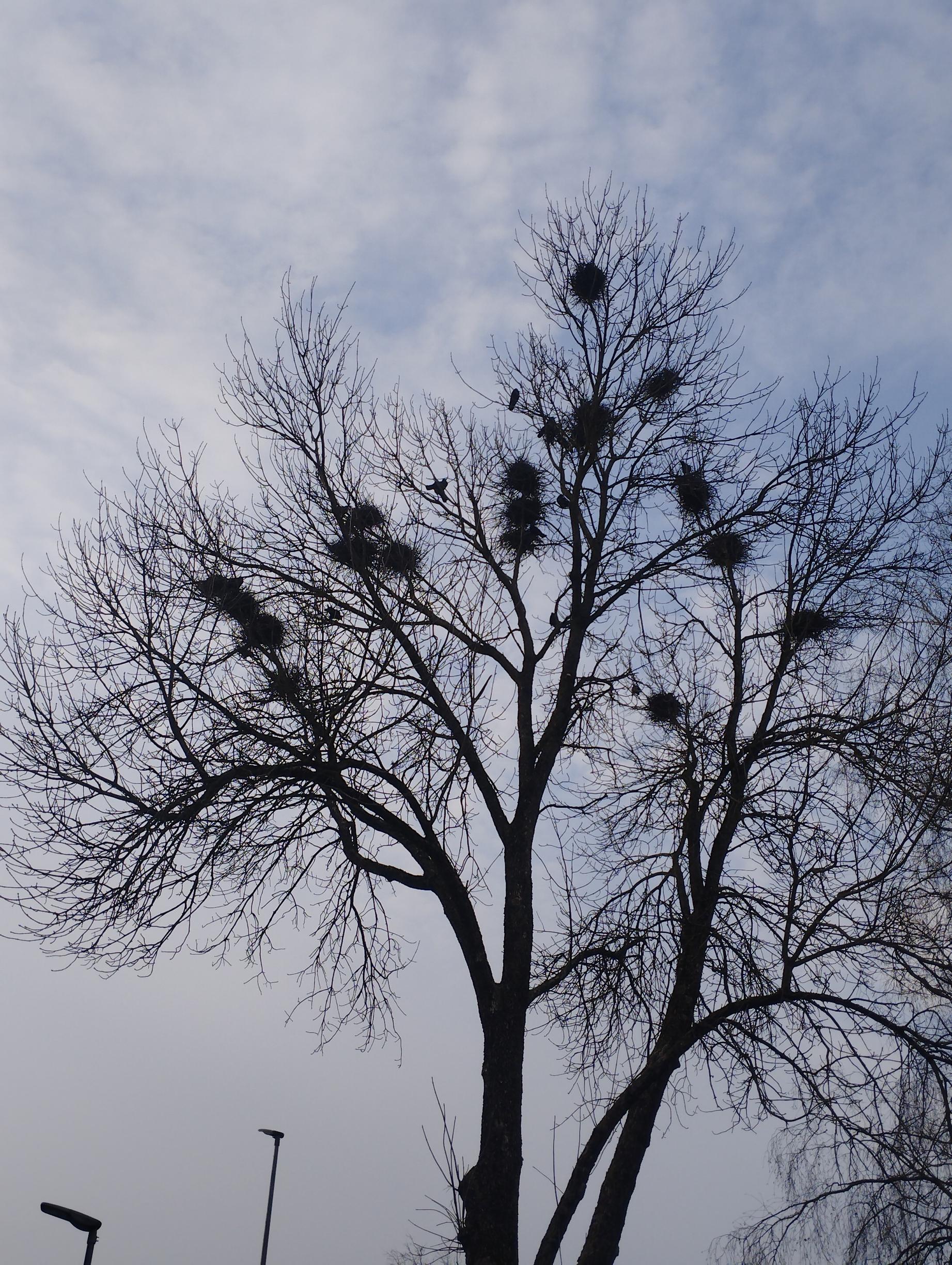 A bunch of birds nests in a tree with an evening sky background