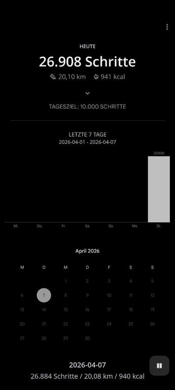 Step counter in German showing (translated): "26908 steps / 20,10 km / 941 kcal"